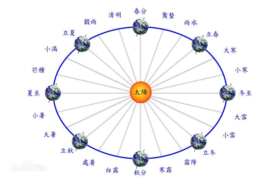 现行的“二十四节气”来自于三百多年前(1645年起沿用至今)订立的根据太阳在回归黄道上的位置来确定节气的方法。“黄道”一圈正好是360°,时间上则是一个公历年的时间,把春分时太阳的黄道位置定为0°,每过15°为一个节气,运行一周又回到春分点,为一回归年。